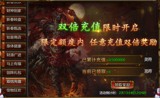 【活动内容】:活动期间,限定额度内任意充值领双倍灵符。