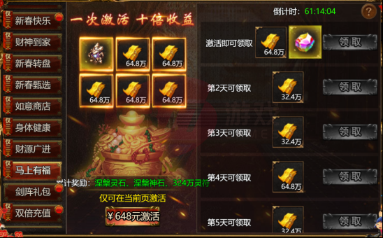 【活动内容】:活动期间,一次激活,奖励灵符、涅槃灵石、涅槃神石。