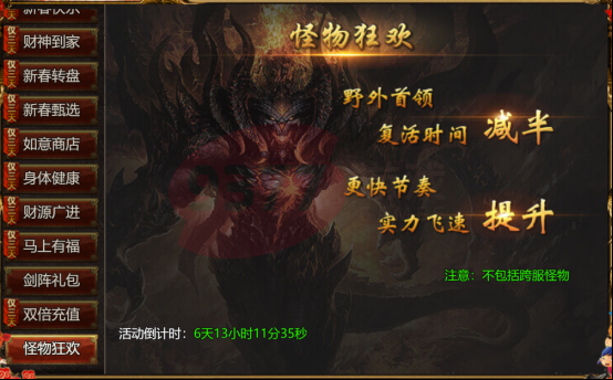 【活动内容】:活动期间,野外BOSS复活时间减半;(不包括跨服怪物)